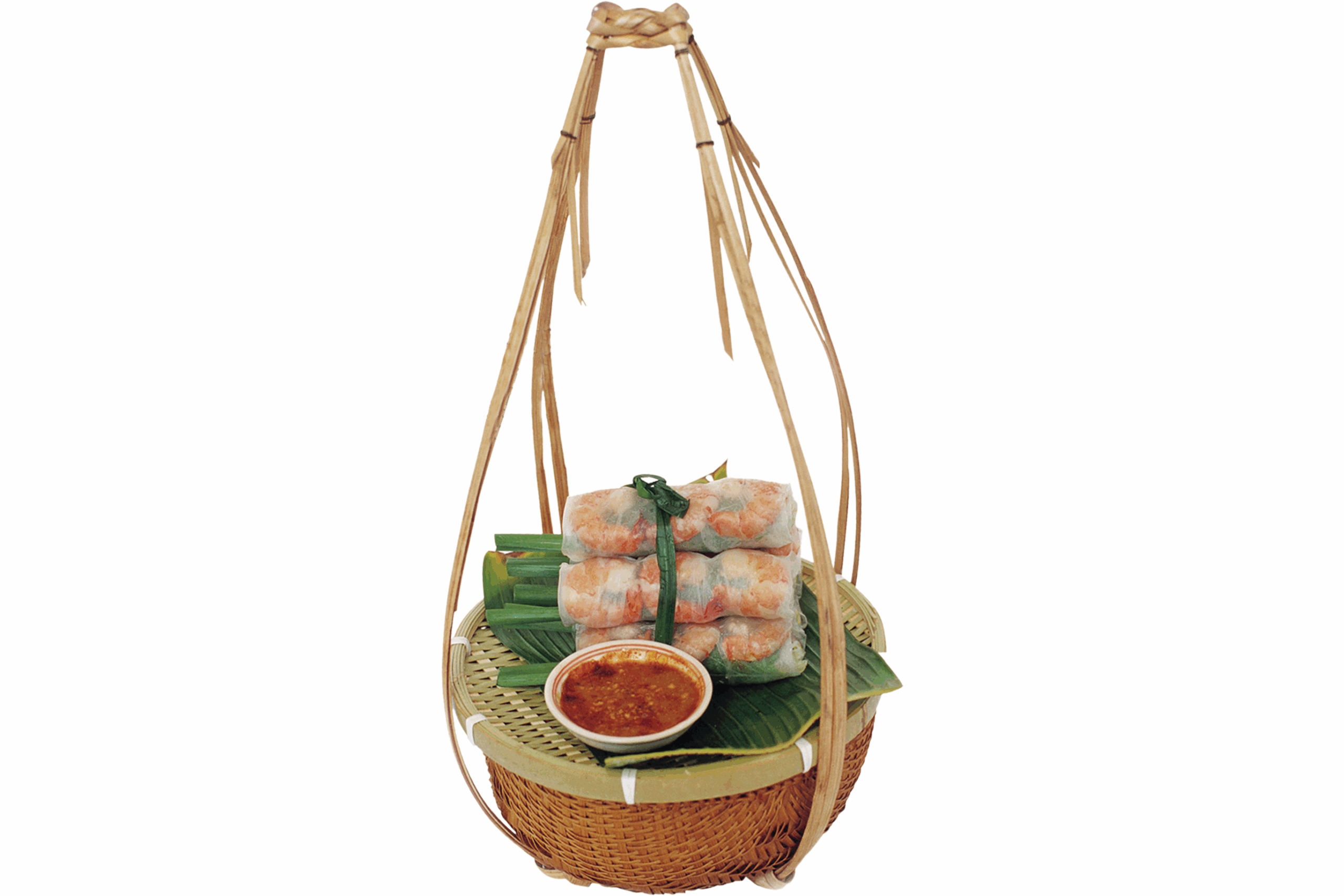 ライスペーパーで海老や豚肉、野菜、ハーブを包んだベトナムの定番料理。ピーナッツ風味の甘辛いソースにつけてお召し上がりください。