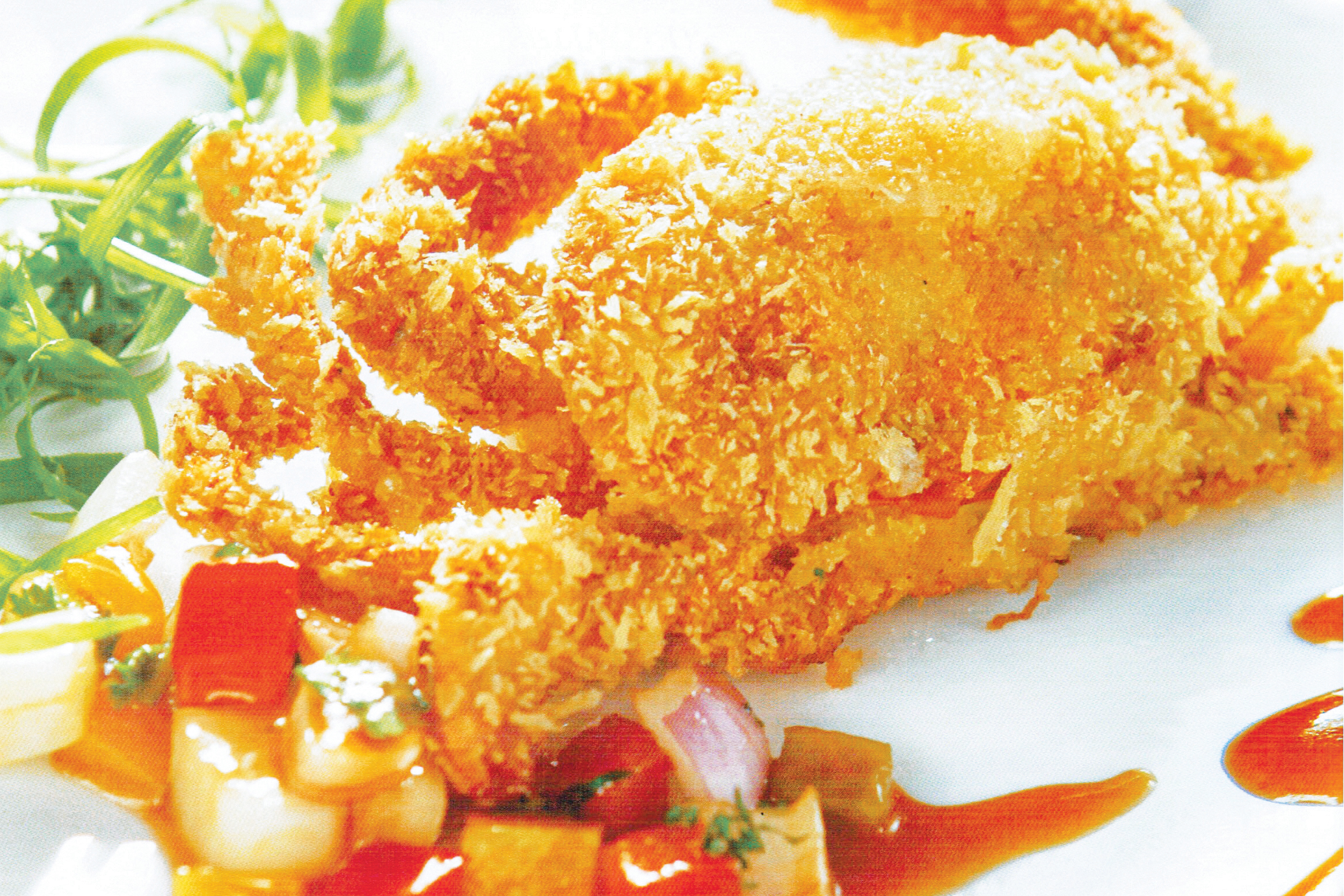Crispy soft-shell crab served with a spicy sauce, combining a crunchy exterior and tender meat for a bold and satisfying bite.