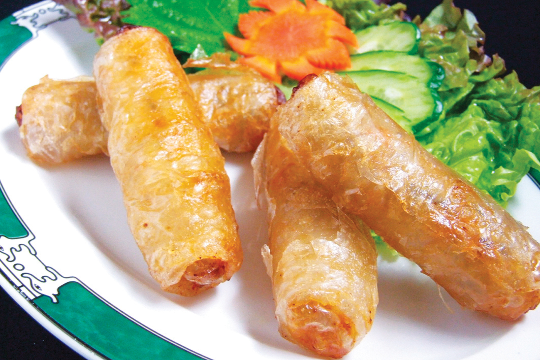 外はカリッと、中は海老や豚肉、野菜がたっぷり入った南部風揚げ春巻き。レタスとハーブで包み、甘酸っぱいヌックマムダレにつけてお召し上がりください。